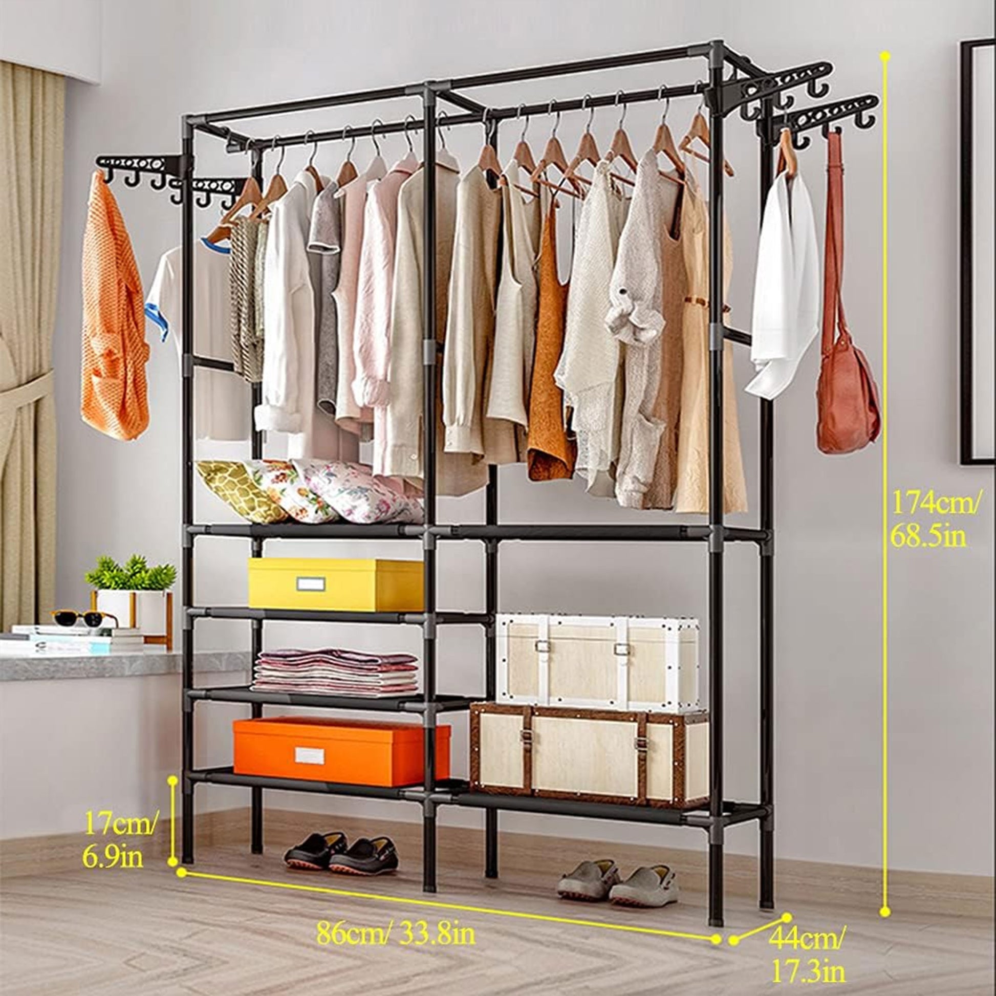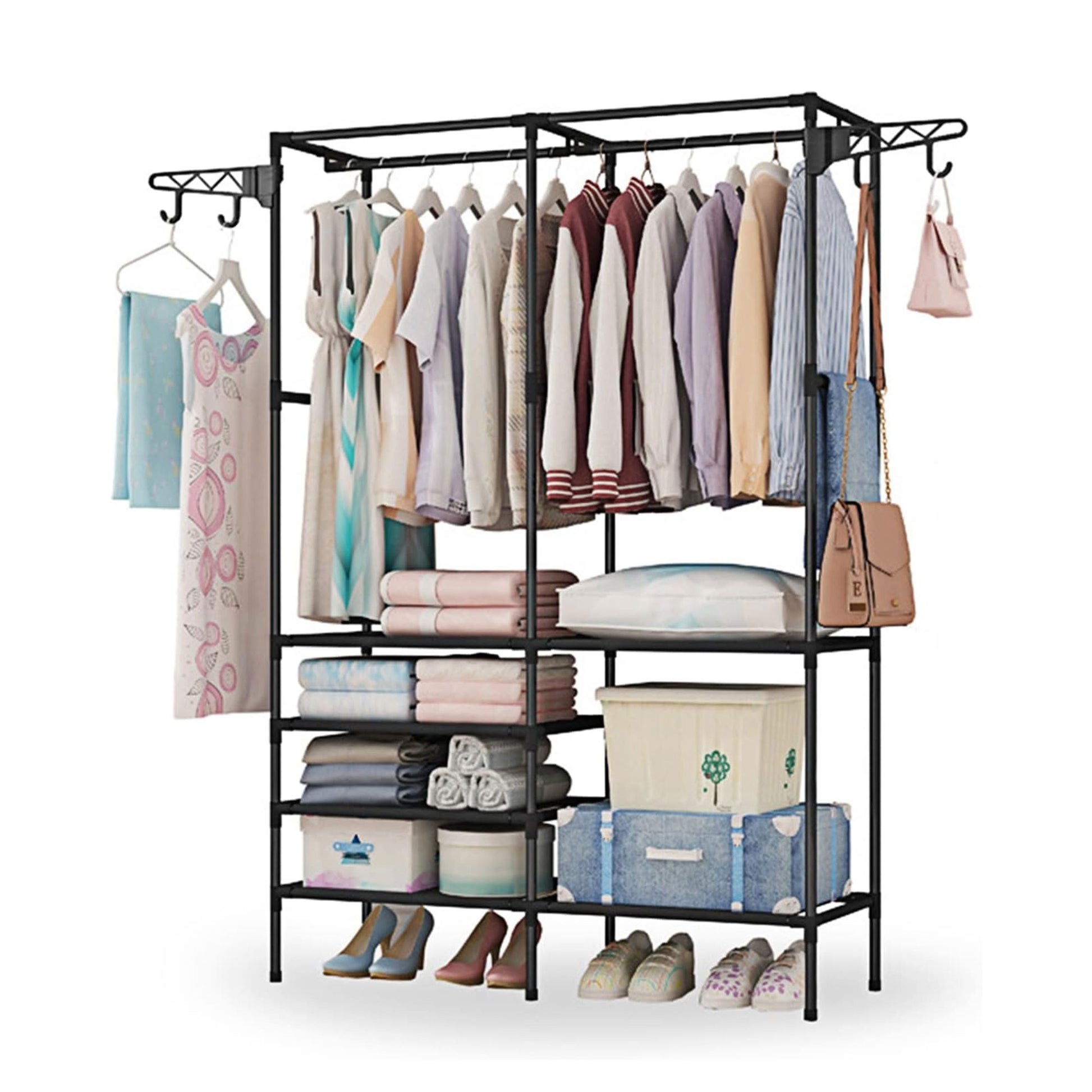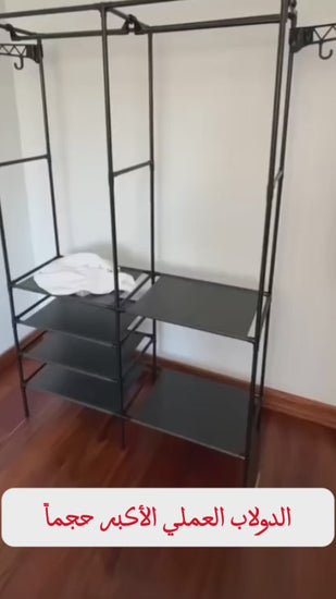 الدولاب العملي الأكبر حجماً يساعدك على تنظيم ملابسك وأغراضك بسهولة. يحتوي على 6 رفوف واسعة، 2 قضيب لتعليق الملابس، و8 علاقات جانبية لترتيب الحقائب والأوشحة. تصميمه خفيف الوزن وسهل التركيب يناسب المساحات الضيقة والغرف المؤقتة. مصنوع من البلاستيك والمعدن ليضمن المتانة وسهولة النقل. مثالي لتنظيم غرف النوم والمخازن بسعر مناسب وجودة عالية.